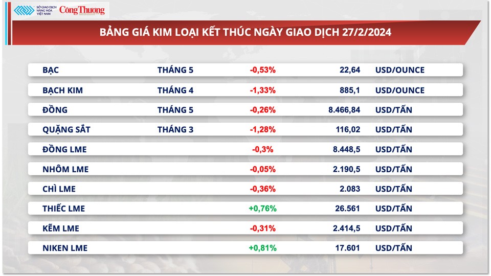 Đối với kim loại cơ bản, giá đồng COMEX quay đầu giảm 0,26%, chốt phiên tại 3,84 USD/pound. Cùng chung xu hướng giảm, giá quặng sắt để mất 1,28% về 116,02 USD/tấn. Đồng USD tăng giá cũng gây áp lực lên giá kim loại cơ bản.