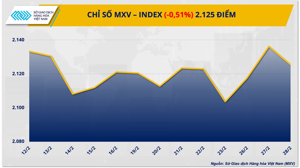 Chỉ số MXV-Index quay đầu giảm 0,51% xuống 2.125 điểm, kết thúc chuỗi tăng hai ngày liên tiếp trước đó. Giá trị giao dịch toàn Sở đạt gần 3.700 tỷ đồng.