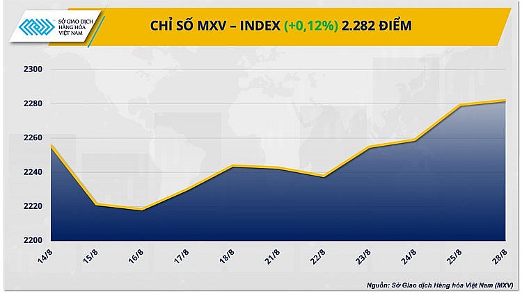 Số liệu từ Sở Giao dịch Hàng hóa Việt Nam (MXV) cho thấy, thị trường hàng hóa nguyên liệu thế giới diễn biến phân hóa trong ngày giao dịch hôm qua 28/8. Lực bán có phần chiếm ưu thế, hỗ trợ chỉ số MXV-Index đóng cửa tăng 0,12% lên 2.282 điểm, nối dài đà tăng sang ngày thứ tư liên tiếp. Giá trị giao dịch toàn sở đạt trên 5.700 tỷ đồng.