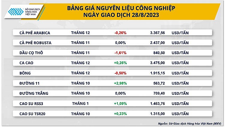 MXV cho biết, ngày 28/8, các mặt hàng trên Sở Giao dịch Liên lục địa Châu u (ICE -EU) như cà phê Robusta, đường trắng nghỉ giao dịch. Tuy nhiên, thị trường vẫn sôi động với những diễn biến mới từ các mặt hàng quan trọng như bông, đường.
