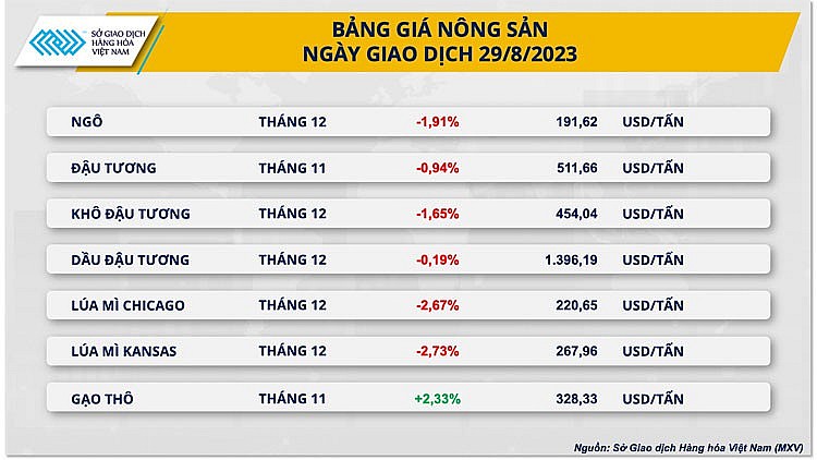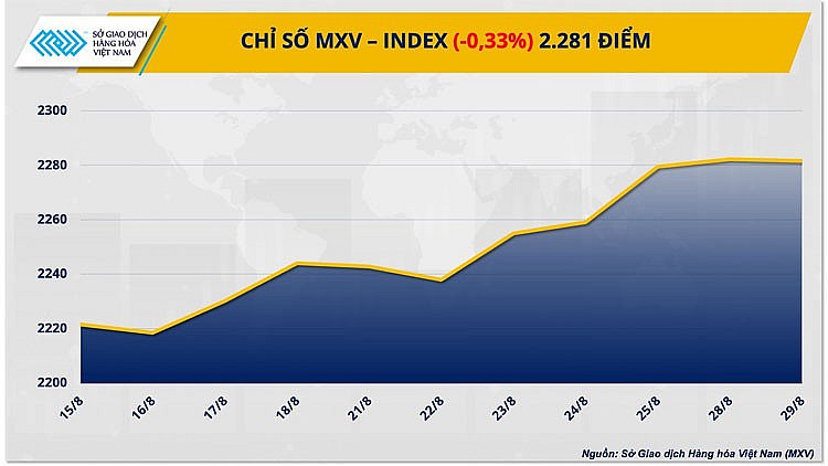 Số liệu từ Sở Giao dịch Hàng hóa Việt Nam (MXV) cho thấy, đóng cửa ngày 29/8, mặc dù lực mua chiếm ưu thế trên cả 3 nhóm mặt hàng năng lượng, kim loại và nguyên liệu công nghiệp nhưng thị trường nông sản giảm mạnh đã kéo chỉ số hàng hóa MXV-Index quay đầu suy yếu 0,03% xuống 2.281 điểm, kết thúc chuỗi tăng 4 ngày liên tiếp. Trong khi đó, giá trị giao dịch toàn sở cũng ghi nhận sụt giảm, đạt trên 4.4 tỷ đồng.