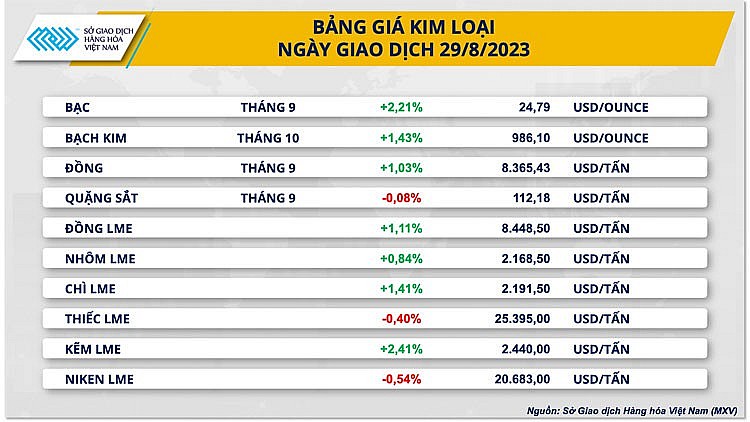 Kết thúc phiên giao dịch ngày 29/8, sắc xanh áp đảo bảng giá thị trường kim loại. Với nhóm kim loại quý, giá bạc tăng mạnh nhất với mức tăng 2,2% lên 24,78 USD/ounce, giá bạch kim tăng 1,43% chốt phiên tại mức 986 USD/ounce. Giá vàng tăng lên mức 1.937 USD/ounce sau khi tăng 0,91%.