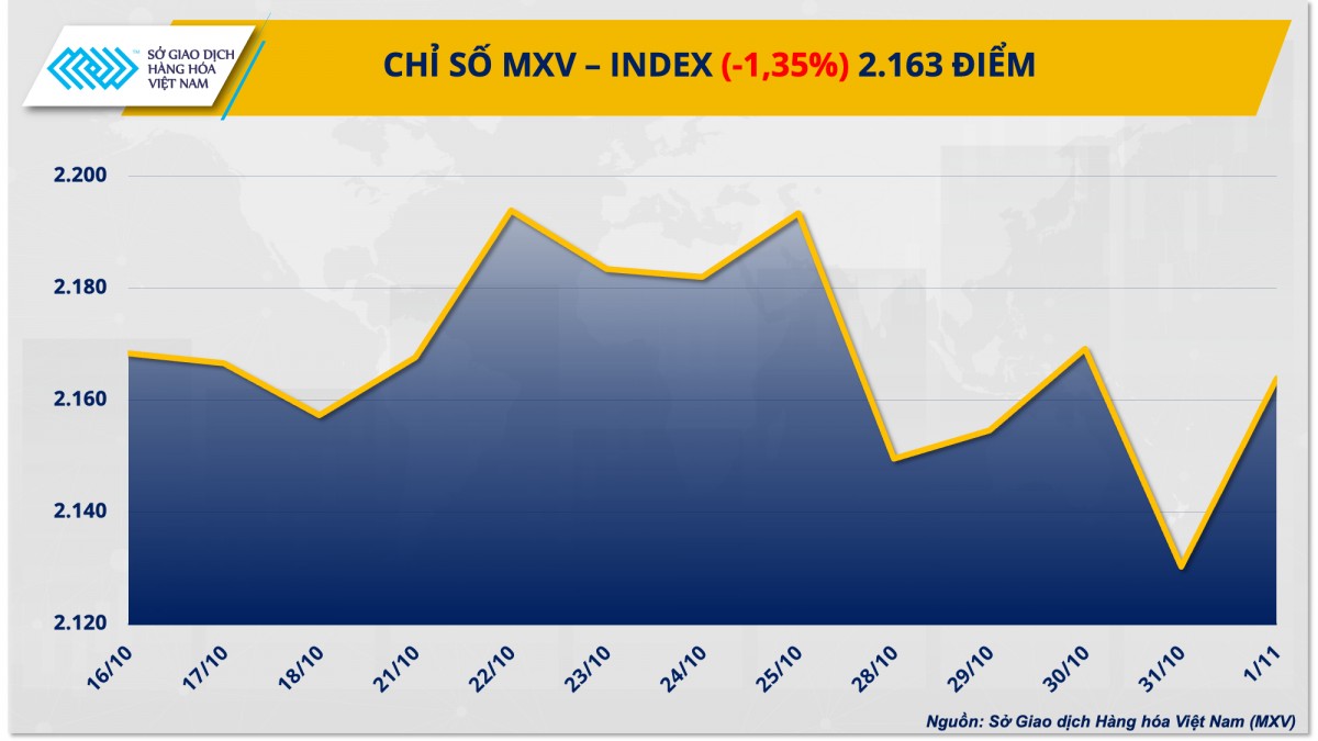 Đóng cửa tuần, chỉ số MXV-Index rơi 1,35% xuống 2.163 điểm. Đáng chú ý, nhóm năng lượng dẫn dắt xu hướng suy yếu của toàn thị trường khi giá toàn bộ 5 mặt hàng đều giảm, riêng hai mặt hàng dầu WTI và Brent lao dốc hơn 3%. Diễn biến cùng chiều, giá các mặt hàng nhóm kim loại quý như bạc và bạch kim cũng hạ gần 3,3% sau hai tuần tăng liên tiếp trước đó.