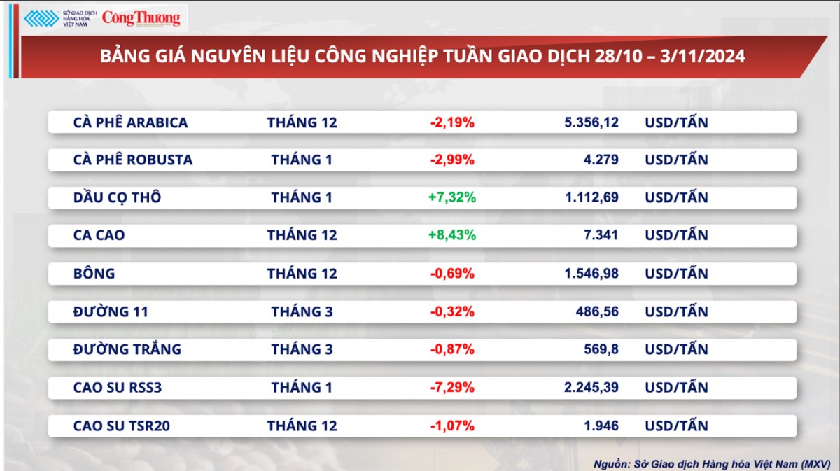 Đáng chú ý, giá quặng sắt đã phục hồi 1,22% lên 102,36 USD/tấn, chủ yếu nhờ kỳ vọng về gói kích thích kinh tế mới từ Trung Quốc. Cũng theo Reuters, nước này đang cân nhắc phát hành hơn 10.000 tỷ nhân dân tệ (1.400 tỷ USD) trái phiếu bổ sung trong vài năm tới nhằm phục hồi kinh tế - một gói tài chính có thể được bổ sung thêm nếu cựu Tổng thống Donald Trump thắng cử tại Mỹ.