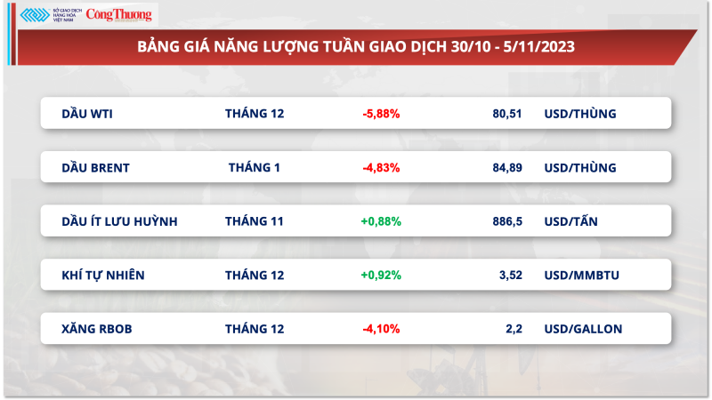 Với 4 trên 5 ngày giảm giá, dầu thô đã kết thúc tuần giao dịch 30/10 – 5/11 trong sắc đỏ, ghi nhận tuần giảm thứ hai liên tiếp. Dầu WTI đánh mất 5,88% giá trị xuống 80,51 USD/thùng, mức thấp nhất trong hai tháng qua. Dầu Brent đánh mất mốc 85 USD/thùng, sau khi giảm 4,83% trong tuần qua.