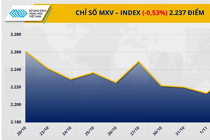 Số liệu từ Sở Giao dịch Hàng hóa Việt Nam (MXV) cho thấy, đóng cửa tuần qua, dù lực mua chiếm ưu thế trên cả ba nhóm nông sản, nguyên liệu công nghiệp và kim loại, tuy nhiên mức giảm rất mạnh của nhiều mặt hàng năng lượng quan trọng đã kéo chỉ số giá hàng hoá MXV-Index suy yếu 0,53% xuống 2.237 điểm.