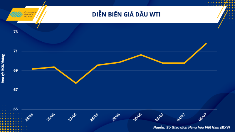 Kết thúc phiên giao dịch ngày 05/07, giá dầu WTI tăng mạnh 2,87% lên mức 71,79 USD/thùng, mức cao nhất trong vòng 2 tuần qua, trong khi giá dầu Brent tăng nhẹ 0,52% lên mức 76,65 USD/thùng.