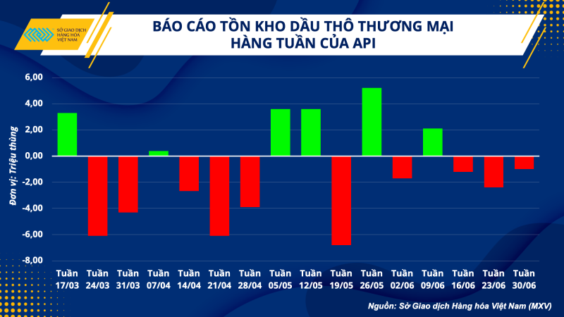 Theo báo cáo của Viện Dầu khí Mỹ (API) rạng sáng nay, tồn kho dầu thô thương mại của Mỹ giảm khoảng 4,4 triệu thùng trong tuần kết thúc ngày 30/06, và là tuần giảm thứ 3 liên tiếp, nhiều hơn mức dự đoán giảm 1 triệu thùng từ hãng tin Reuters, trong khi dự trữ xăng và sản phẩm chưng cất tăng lần lượt là 1,6 triệu và 0,6 triệu thùng. Dự trữ dầu thô giảm phản ánh kỳ vọng về nhu cầu nhiên liệu gia tăng trong mùa di chuyển cao điểm và hỗ trợ cho giá dầu.