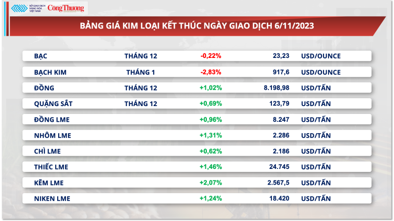 Kết thúc ngày giao dịch 6/11, thị trường kim loại ghi nhận diễn biến phân hóa rõ rệt giữa nhóm kim loại quý và kim loại cơ bản. Đối với nhóm kim loại quý, giá ba mặt hàng đồng loạt suy yếu, chấm dứt hai phiên tăng liên tiếp. Trong đó, giá bạch kim dẫn dắt đà giảm của nhóm khi giảm 2,83%, dừng chân ở mức 917,6 USD/ounce. Giá bạc đóng cửa tại 23,23 USD/ounce sau khi suy yếu 0,22%. Giá vàng cũng để mất 0,73%, chốt phiên tại mức 1.977,68 USD/ounce.