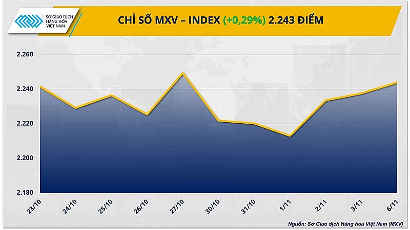 Số liệu từ Sở Giao dịch Hàng hoá Việt Nam (MXV) cho thấy, kết thúc ngày giao dịch đầu tuần, 23 trên tổng số 31 mặt hàng nguyên liệu đồng loạt đóng cửa trong sắc xanh, hỗ trợ chỉ số MXV-Index tăng 0,29% lên 2.243 điểm, nối dài đà tăng sang ngày thứ ba liên tiếp.