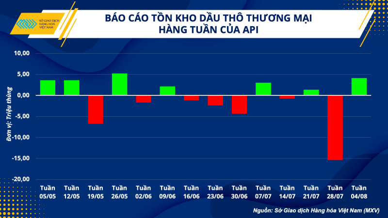 Rạng sáng nay theo giờ Việt Nam, báo cáo của Viện dầu khí Mỹ (API) cho thấy tồn kho dầu thô thương mại tăng 4,1 triệu thùng trong tuần kết thúc ngày 4/8, cao hơn nhiều so với dự báo tăng 0,6 triệu thùng. Giá dầu nhiều khả năng sẽ gặp áp lực bán nhẹ trong phiên mở cửa, dẫn đến giá tăng.