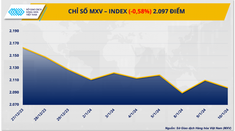 Chốt ngày, chỉ số MXV-Index của 3 trên 4 nhóm mặt hàng trong sắc đỏ đẩy chỉ số MXV-Index rơi 0,58% xuống 2.097 điểm. Giá trị giao dịch toàn Sở tăng 12,35%, lên mức hơn 5.300 tỷ đồng, đạt mức cao nhất từ đầu năm 2024 đến nay.