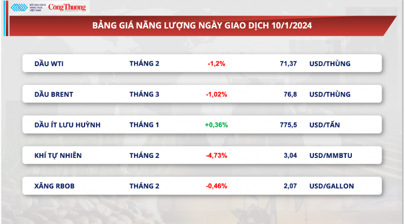 Theo Sở Giao dịch Hàng hóa Việt Nam (MXV), kết thúc ngày giao dịch 10/1, giá dầu diễn biến giằng co và chốt phiên giảm hơn 1%. Lực mua duy trì mạnh mẽ vào đầu phiên trong bối cảnh nhóm phiến quân Houthi tiến hành chiến dịch quân sự lớn nhất từ trước đến nay vào các tuyến đường vận chuyển thương mại ở Biển Đỏ. Hơn nữa, tình trạng hỗn loạn tại Ecuador làm tăng rủi ro gián đoạn nguồn cung cũng góp phần hỗ trợ giá dầu. Tuy nhiên, nhu cầu nhiên liệu yếu và tồn kho sản phẩm dầu tăng mạnh đã kéo giá dầu đảo chiều giảm trở lại về cuối phiên.