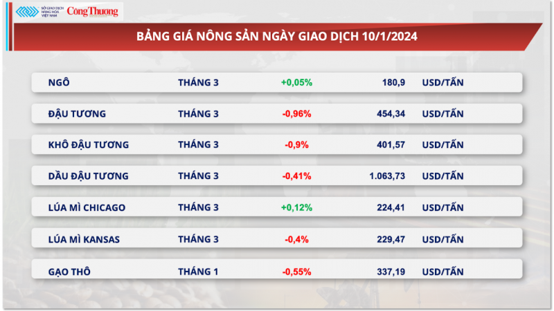 Giá khô đậu tương và giá dầu đậu tương cũng đồng loạt suy yếu trong phiên hôm qua. Thời tiết thuận lợi ở Argentina tiếp tục gây áp lực lớn lên giá khô đậu. Trong khi đó, sự suy yếu của giá dầu thô đã thúc đẩy lực bán đối với dầu đậu.