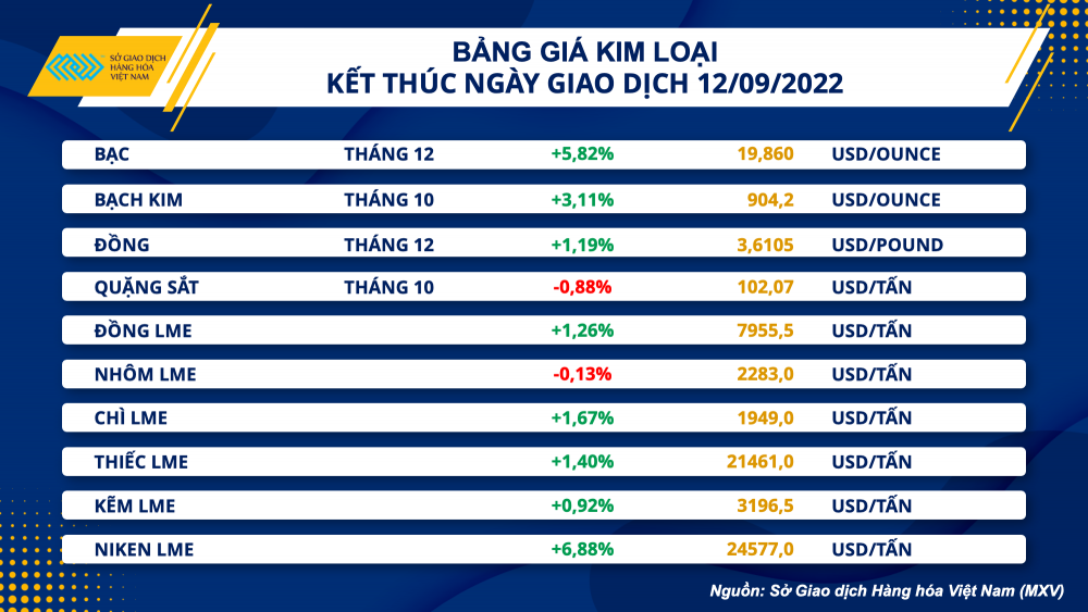 Theo Sở giao dịch hàng hóa Việt Nam (MXV), trong khi Báo cáo cung cầu nông sản tháng 9 của Bộ Nông nghiệp Mỹ (USDA) được phát hành vào tối qua đã gây ra biến động mạnh đối với các mặt hàng ngũ cốc và hạt lấy dầu trên Sở Chicago, thì yếu tố vĩ mô liên quan tới đà suy yếu của đồng Dollar Mỹ là nguyên nhân chính kéo theo lực mua trên thị trường kim loại. Các thông tin đa dạng đã làm tăng sức hút đối với các nhà đầu tư trong phiên. Giá trị giao dịch toàn Sở tăng vọt 37% lên hơn 6.000 tỷ đồng, mức cao nhất kể từ giữa tháng 6 cho đến nay.