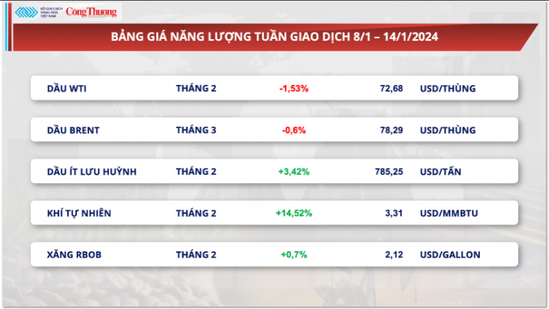 Đối với kim loại cơ bản, giá đồng COMEX giảm 1,72% xuống 3,74 USD/pound, đánh dấu tuần giảm thứ ba liên tiếp. Sức ép vĩ mô và triển vọng tiêu thụ yếu kém tại Trung Quốc vẫn đang là yếu tố chính gây sức ép lên giá đồng. Dữ liệu hải quan cho thấy Trung Quốc đã nhập khẩu hơn 459.300 tấn đồng trong tháng 12/2023, giảm 16,6% so với tháng 11 và giảm 10,6% so với cùng kỳ năm 2022