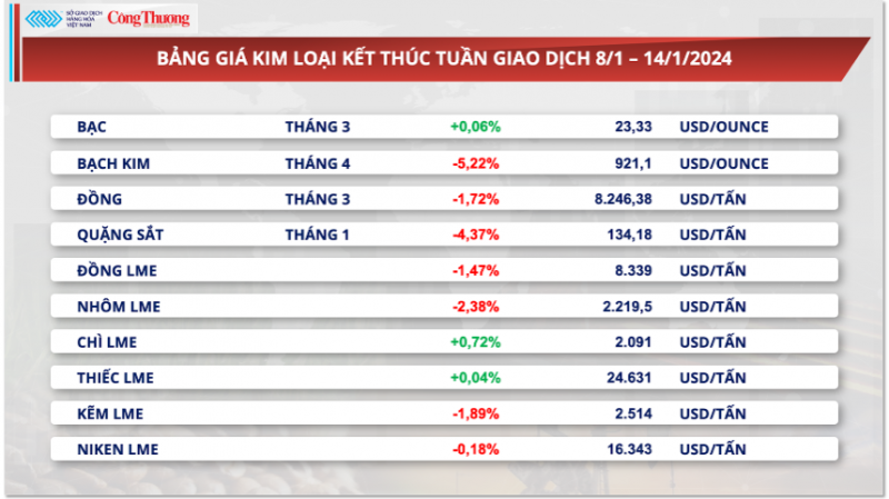 Trái lại, giá quặng sắt ‘bốc hơi” 4,37% về 134,18 USD/tấn, chấm dứt chuỗi tăng ba tuần liên tiếp. Bất chấp việc Trung Quốc phát đi tín hiệu tiếp tục nới lỏng tiền tệ để hỗ trợ nền kinh tế, giá quặng sắt vẫn giảm do triển vọng tiêu thụ kém. Trung Quốc đã nhập khẩu 100,86 triệu tấn quặng sắt trong tháng 12/2023, giảm 1,83% so với tháng 11, do nhiều nhà máy tiến hành bảo trì khi biên lợi nhuận thép giảm.