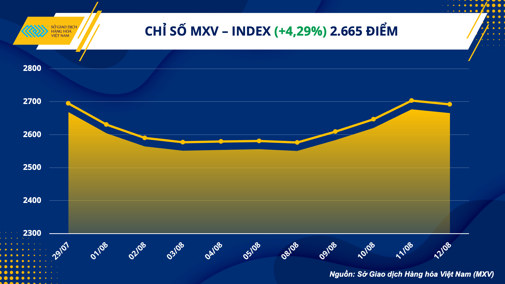 Theo Sở Giao dịch Hàng hóa Việt Nam (MXV), kết thúc tuần giao dịch 8 - 14/08, lực mua áp đảo trên thị trường hàng hoá với 29 trong tổng số 31 mặt hàng đang được giao dịch liên thông thế giới tại Sở Giao dịch Hàng hoá Việt Nam (MXV) đồng loạt tăng giá. Điều này đã giúp chỉ số MXV-Index phục hồi trong sắc xanh sau tuần suy yếu trước đó, với mức tăng 4,29% lên 2.665,28 điểm.