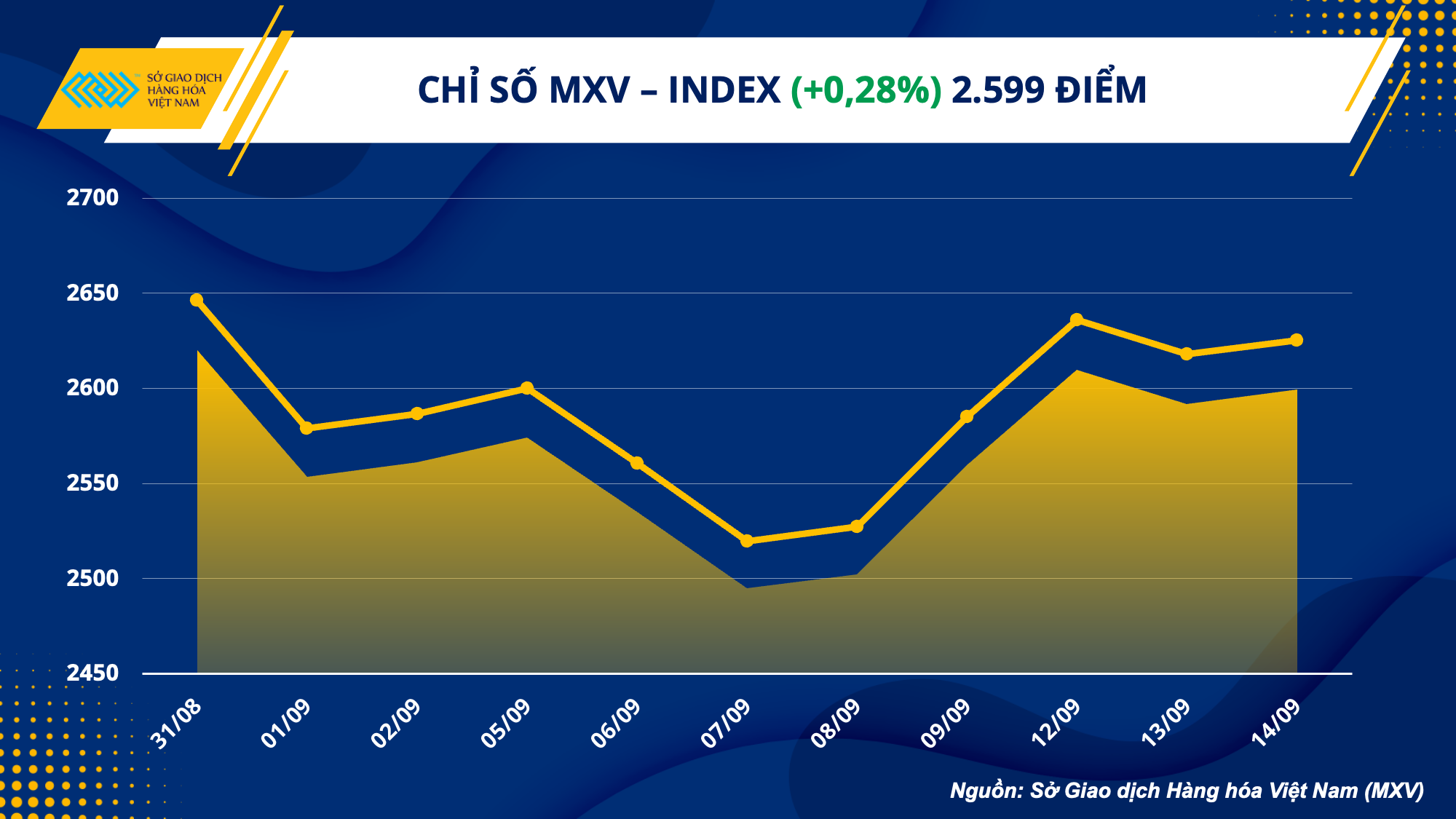 Thông tin từ Sở Giao dịch Hàng hoá Việt Nam (MXV), phiên giao dịch sáng nay, diễn biến phân hoá chia bảng giá hàng hoá nguyên liệu thế giới thành 2 nửa xanh đỏ. Lực mua có phần chiếm ưu thế, đặc biệt ở thị trường năng lượng đã giúp chỉ số MXV-Index đảo chiều tăng nhẹ 0,28%, lên mức 2.599 điểm. Giá trị giao dịch toàn Sở tăng mạnh gần 10%, đạt 5.400 tỷ đồng.