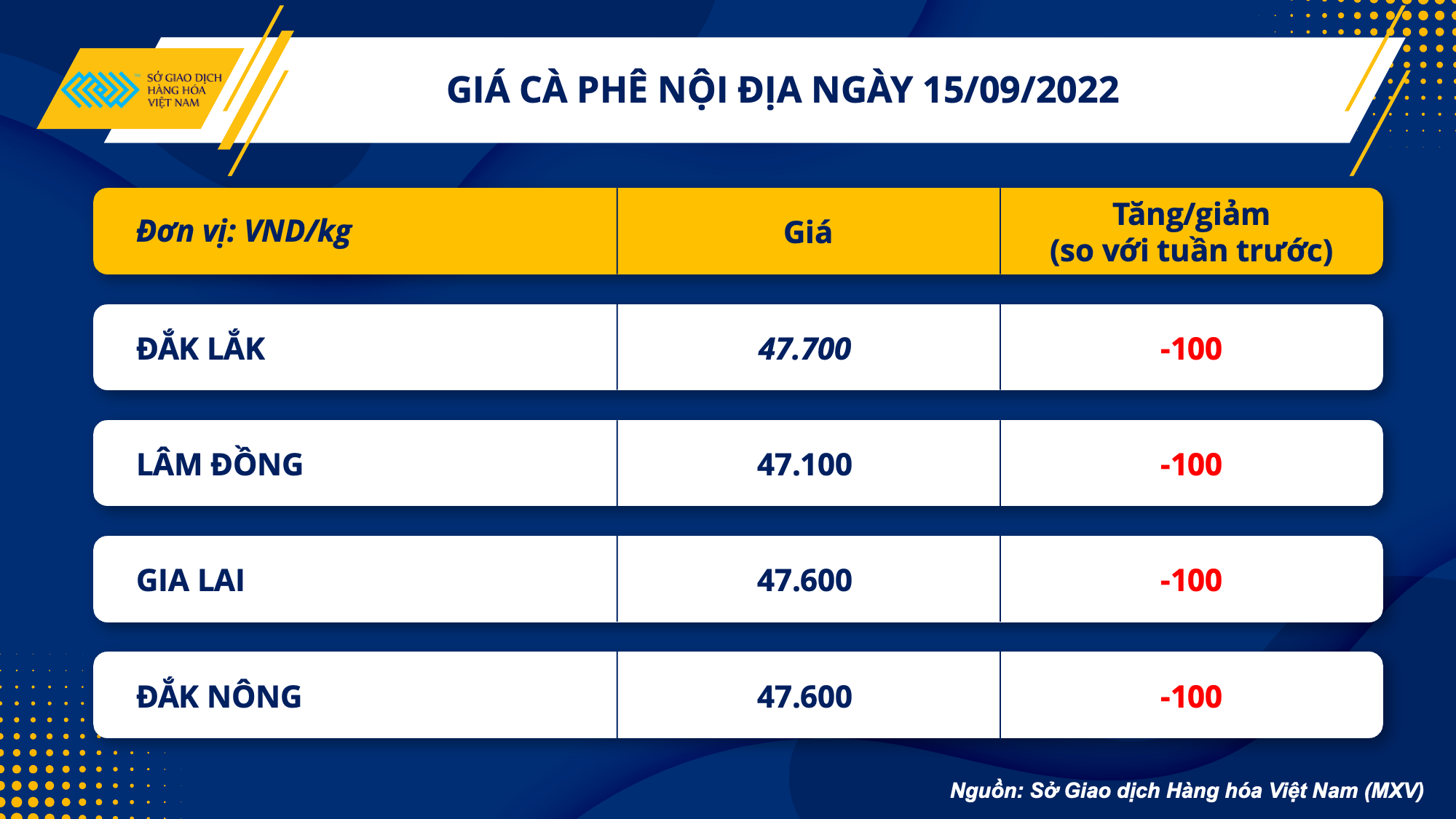 Trên thị trường nội địa, giá cà phê nhân xô tại Tây Nguyên và các tỉnh Nam Bộ liên tục giảm từ đầu tuần đến nay. Ghi nhận trọng sáng nay, giá cà phê thu mua tiếp tục giảm thêm 100 đồng/kg sau ngày giảm mạnh trước đó, hiện đang dao động trong khoảng giá 47.100 - 47.700 đồng. Như vậy so với đầu tháng 09, giá cà phê trong nước đã giảm đến 1.000 đồng/kg.