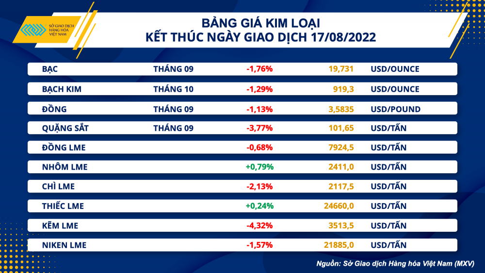 Kết thúc ngày giao dịch 17/08, sắc đỏ cho thấy xu hướng giảm chiếm ưu thế trên bảng giá kim loại. Bạc đánh mất mốc 20 USD/pound với mức giảm 1,76%, dẫn đầu đà giảm trong nhóm kim loại quý. Bạch kim nối dài đà suy yếu sang ngày thứ 3, giảm 1,29% xuống còn 919,3 USD/ounce.