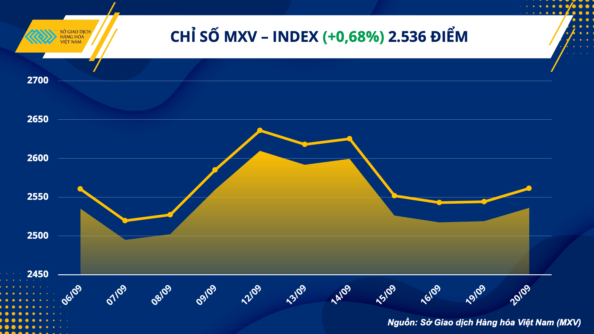 Theo Sở Giao dịch hàng hóa Việt Nam (MXV), thị trường hàng hoá hôm nay tiếp tục tăng nhẹ ngày thứ 2 liên tiếp. Lực mua chủ yếu đến từ nhóm nông sản, với toàn bộ 7/7 mặt hàng đồng loạt tăng giá, đã hỗ trợ chỉ số MXV-Index tăng 0,68% lên 2.536 điểm. Giá trị giao dịch toàn Sở cũng ghi nhận mức tăng mạnh hơn 10% so với ngày trước đó, đạt mốc 5.000 tỷ đồng.