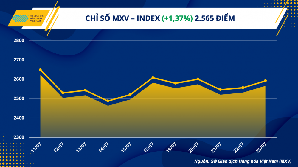 Theo Sở Giao dịch hàng hóa Việt Nam (MXV), nông sản dẫn dắt đà tăng với sự phục hồi của 5 trên tổng số 6 mặt hàng trong nhóm. Nhóm năng lượng tiếp tục duy trì sức hút của dòng tiền đầu tư khi giá trị giao dịch tăng lên mức gần 2.000 tỷ đồng. Kết thúc phiên, giá trị giao dịch toàn Sở duy trì ở mức hơn 3.500 tỷ đồng.