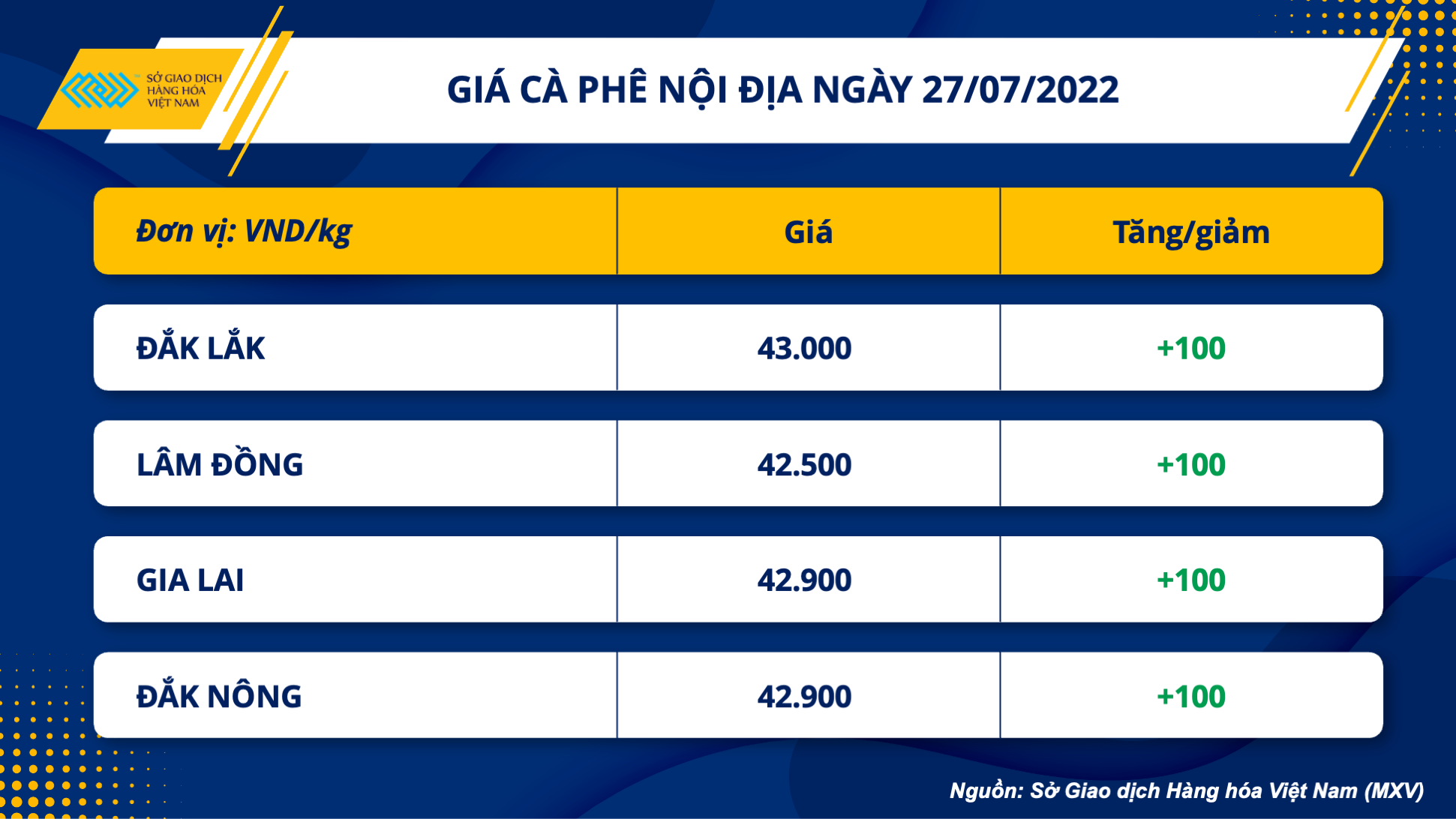 Trên thị trường nội địa, giá cà phê nhân xô tại Tây Nguyên và các tỉnh Nam Bộ tiếp tục duy trì được đà tăng từ đầu tuần. Ghi nhận trong sáng nay, giá cà phê thu mua trên toàn quốc đồng loạt điều chỉnh tăng thêm khoảng 100 đồng/kg so với sáng hôm qua, dao động trong khoảng 42.500 - 43.000 đồng/kg.