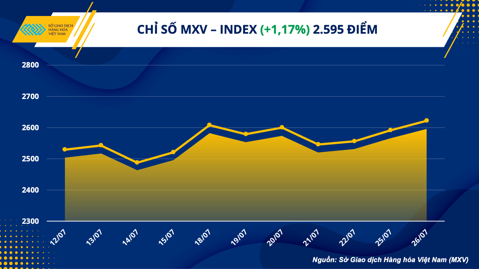 Theo Sở Giao dịch Hàng hóa Việt Nam (MXV), thị trường hàng hoá phiên vừa qua trên bảng giá sắc xanh hoàn toàn chiếm ưu thế. Lực mua áp đảo trên cả 4 nhóm mặt hàng nguyên liệu đã hỗ trợ chỉ số MXV- Index có ngày tăng thứ 2 liên tiếp, lên 2.595 điểm, là mức cao nhất trong vòng 2 tuần qua. Tuy nhiên, giá trị giao dịch toàn Sở lại có sự sụt giảm, đạt hơn 3.000 tỷ đồng, do tâm lý thận trọng của nhà đầu tư trước những biến động rất mạnh của thị trường.
