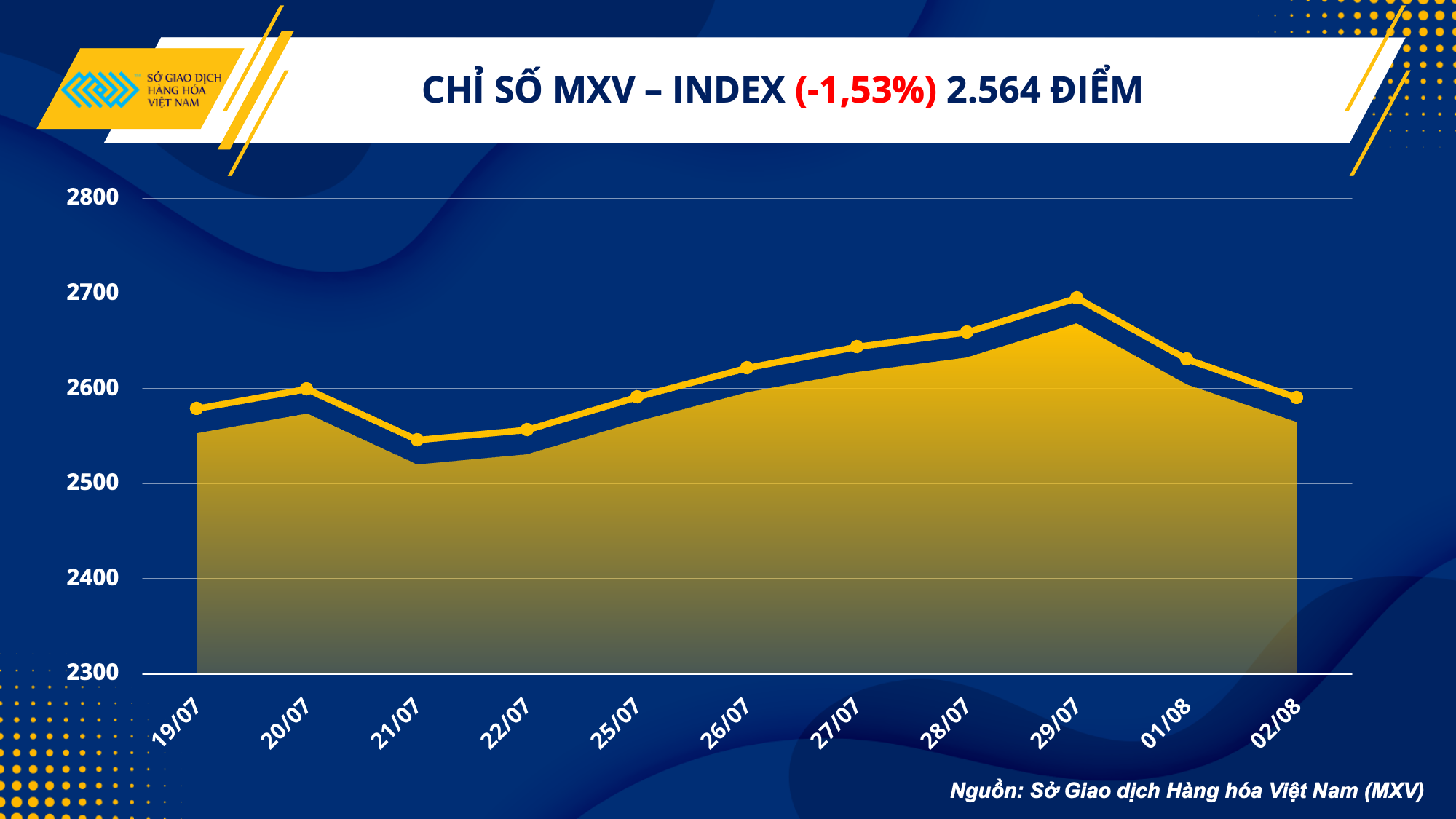 Theo Sở Giao dịch Hàng hóa Việt Nam (MXV), Nông sản, Nguyên liệu công nghiệp, Kim loại và Năng lượng là 4 nhóm hàng hóa đang được giao dịch liên thông thế giới tại Sở Giao dịch Hàng hoá Việt Nam có lực bán áp đảo từ đầu tuần đến nay. Điều này đã kéo chỉ số hàng hoá MXV-Index giảm 1,53% xuống mức 2.564 điểm. Giá trị giao dịch toàn Sở cũng có sự suy yếu nhẹ, tuy nhiên vẫn đạt mức 4.200 tỷ đồng.