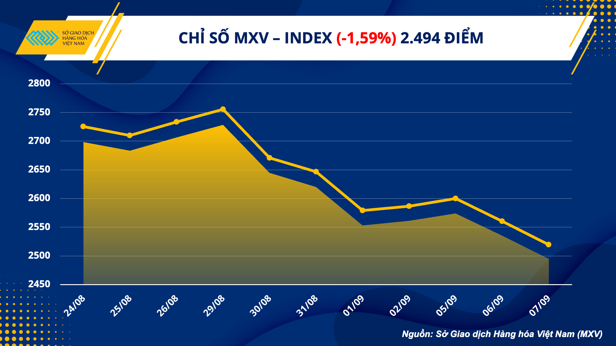 Thông tin từ Sở Giao dịch Hàng hoá Việt Nam (MXV), thị trường hàng hoá thế giới nối dài đà suy yếu sang ngày thứ 2 liên tiếp. Chỉ số MXV-Index giảm 1,6% xuống 2.494 điểm, thấp nhất trong vòng gần 2 tháng trở lại đây. Tuy nhiên, dòng tiền đầu tư có sự gia tăng mạnh mẽ, giá trị giao dịch toàn Sở đạt gần 6.000 tỷ đồng, tăng 40% so với ngày trước đó.