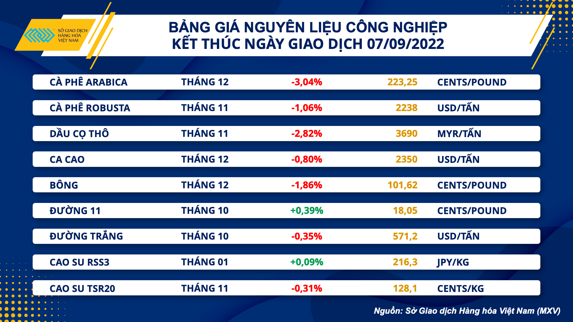 Nhóm năng lượng tiếp tục dẫn dắt xu hướng chung của toàn thị trường với sự lao dốc của các mặt hàng xăng dầu trước một loạt các thông tin về suy thoái kinh tế trên thế giới. Cùng chung diễn biến, sắc đỏ cũng chiếm ưu thế trên bảng giá của cả 3 nhóm hàng hoá nguyên liệu còn lại. 8 trên 9 hợp đồng nhóm nguyên liệu công nghiệp đồng loạt đóng cửa suy yếu trong ngày hôm qua.