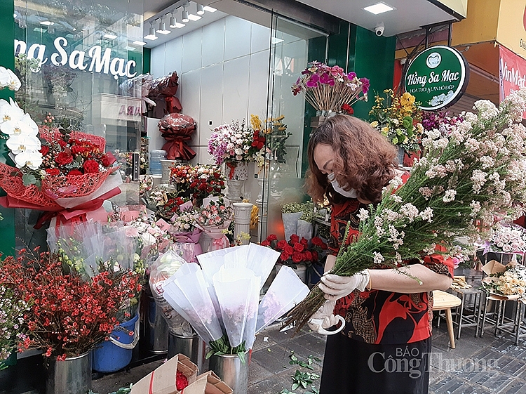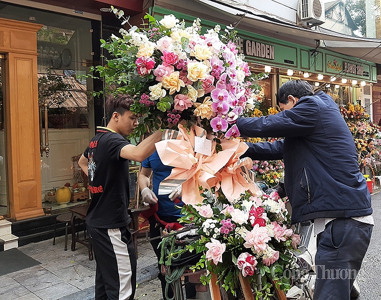 | Khách mua lẵng hoa tươi tại cửa hàng trên phố Ngô Thì Nhậm |
