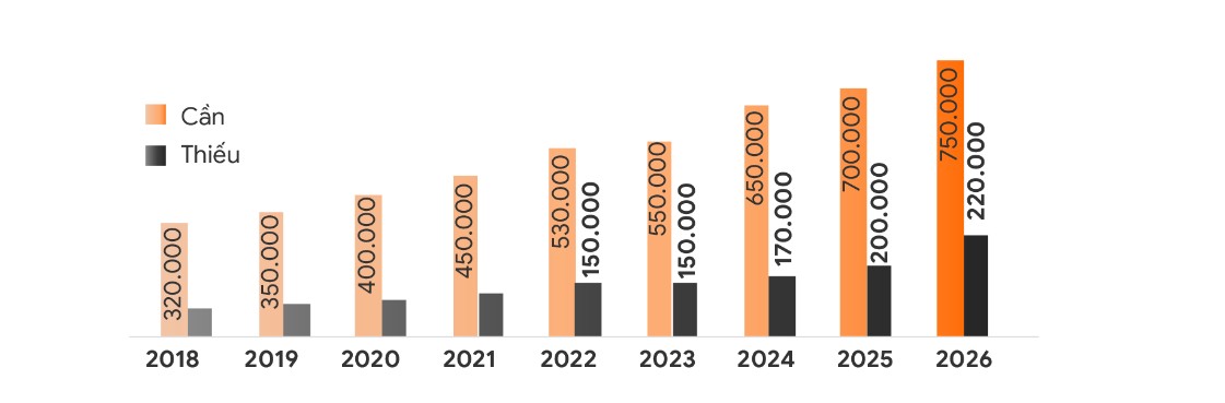 Theo Báo cáo, mức lương trung bình của lập trình viên tại Việt Nam vào năm 2024 ước tính dao động từ 1.100 đến 3.000 USD mỗi tháng, tùy thuộc vào kỹ năng và kinh nghiệm. Sự phát triển nhanh chóng của thị trường công nghệ không chỉ mở ra nhiều cơ hội việc làm mà còn đặt ra những thách thức lớn đối với các doanh nghiệp. Một trong những thách thức đáng kể là sự thiếu hụt nguồn nhân lực có kỹ năng chuyên môn sâu. Theo số liệu từ Bộ Thông tin và Truyền thông, thị trường IT Việt Nam cần bổ sung ít nhất 500.000 lao động công nghệ từ nay đến năm 2025 để đáp ứng nhu cầu. Điều này đặt ra yêu cầu cấp bách đối với doanh nghiệp trong việc triển khai các chương trình đào tạo upskilling và reskilling cho nhân viên.
