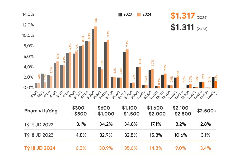 "Nhu cầu tuyển dụng nhân sự công nghệ cao đang tăng mạnh, với mức lương cho các chuyên gia trong các lĩnh vực này liên tục gia tăng. Mức lương trung bình của lập trình viên tại Việt Nam vào năm 2024 ước tính dao động từ 1.100 đến 3.000 USD mỗi tháng, tùy thuộc vào kỹ năng và kinh nghiệm. Đặc biệt, các vị trí chuyên sâu như kỹ sư AI và chuyên gia bảo mật thông tin có thể nhận được mức lương vượt xa con số trung bình, nhờ vào sự khan hiếm nhân lực và tầm quan trọng của những vai trò này trong các doanh nghiệp", báo cáo cho biết.