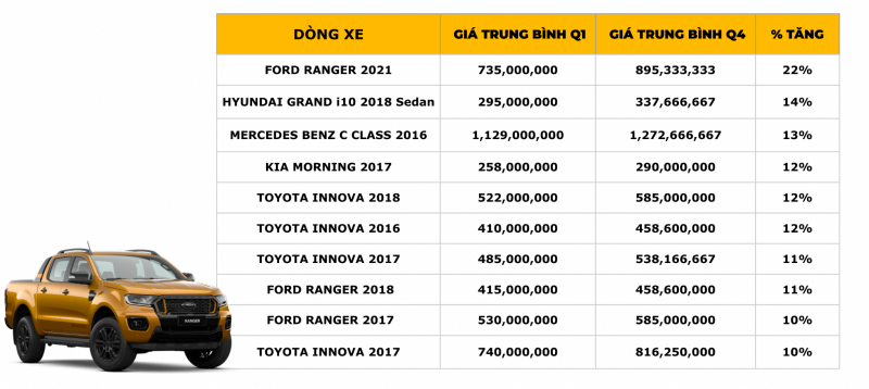 Theo số liệu từ Chợ Tốt Xe, Ford Ranger 2021 có mức tăng trung bình lên đến 160 triệu đồng (tương đường 22%). Với thiết kế hoàn toàn được nâng cấp so với đời 2020, trong đó nổi bật nhất ở phần lưới tản nhiệt cùng dải đèn LED ban ngày, phiên bản 2021 có sức thu hút lớn với các tín đồ ưa thích trải nghiệm xê dịch; điều này còn đặc biệt đúng khi theo ghi nhận từ số liệu thống kê, các phiên bản 2019 và 2020 có mức giảm giá lần lượt 171 triệu đồng (tương đương 21%) và 130 triệu đồng (tương đương 15%).
