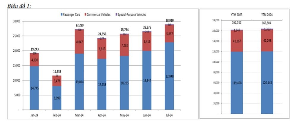 Trong tháng 7, có 22.847 xe du lịch được bán, tăng 15% so với tháng trước; ngoài ra có 5.857 xe thương mại, giảm 9% và 215 xe chuyên dụng, tăng 1% so với tháng trước.