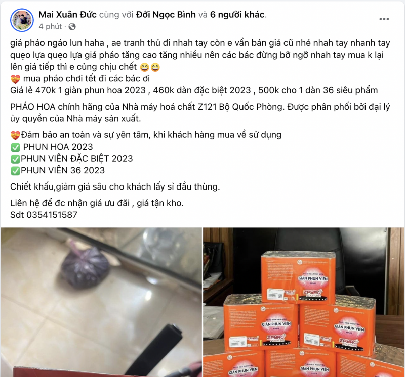 Chủ tài khoản Mai Xuân Đức chào giá bán lẻ: Phun hoa 470.000/giàn, phun viên đặc biệt 460.000/giàn, phun viên 36 ống giá 500.000/giàn. Bên cạnh đó, người này có nhắc nhở người mua nhanh tay mua trước khi hàng hết, giá pháo tiếp tục tăng mạnh. Đặc biệt hơn, có nơi “hét giá” lên hơn 1 triệu đồng/giàn.