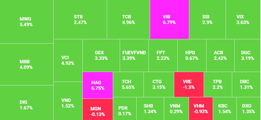 | Sàn HoSE xuất hiện mã tăng kịch trần là VIB tăng 6,79%, HAG tăng 6,75%, kế tiếp là LPB tăng 6,26%, TCB tăng 4,96% |