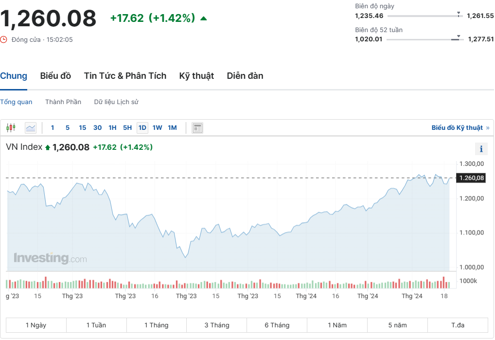 | Trong phiên giao dịch hôm nay, VN-Index tăng 17,62 điểm (+1,42%) lên 1.260 điểm |