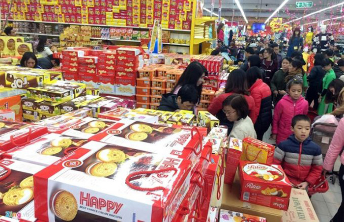 Tại các trung tâm thương mại, siêu thị lớn lượng hàng hóa dồi dào, sức mua tăng 30-35% so với ngày thường nhưng giá cả ổn định. Hàng công nghệ phẩm chế biến giá ổn định do nguồn cung lớn, mẫu mã bao bì chất lượng hàng Việt Nam sản xuất có sự tiến bộ vượt trội so với Tết Đinh Dậu 2017 và các năm trước, chiếm được thị phần lớn, cạnh tranh được với hàng tương tự, ngoại nhập. Hàng thực phẩm tươi sống: giá ổn định do nguồn cung dồi dào. Giá thịt bò, gia cầm, hải sản có nhích nhẹ so với ngày thường, phản ánh xu thế chung sức mua tăng trong dịp Tết. Liên quan đến hàng rau củ quả, hoa, cây cảnh, mặt hàng rau xanh tăng nhẹ do thời tiết rét đậm kéo dài, nhưng nguồn cung dồi dào.