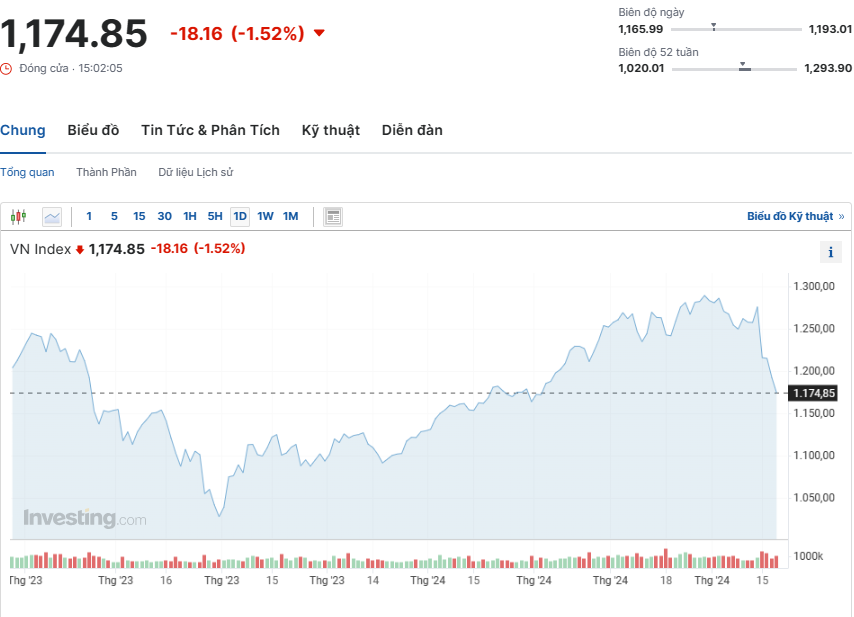 | Kết phiên giao dịch ngày 19/4, VN-Index giảm 18,16 điểm (-1,52%), xuống còn 1.174 điểm |