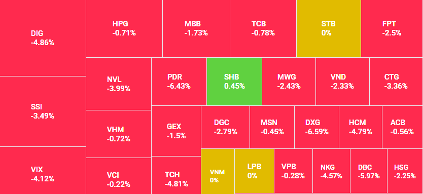 | Thị trường chìm trong sắc đỏ, VN-Index giảm gần 14 điểmPhiên giao dịch đầu tuần chìm trong sắc đỏ, VN-Index giảm gần 5 điểmThanh khoản suy yếu kéo VN-Index giảm hơn 4 điểm |