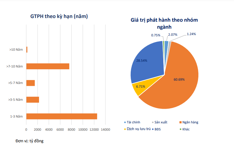 Nhóm Ngân hàng đang dẫn đầu về giá trị phát hành với tổng giá trị 42.382 tỷ đồng, tương đương 37,4% tổng giá trị phát hành. Kỳ hạn từ 1 - 3 năm chiếm phần lớn giá trị phát hành trong nhóm này với 31.049 tỷ đồng, chiếm 73,26% và với kỳ hạn từ 7 năm trở lên chiếm 23,44% với giá trị phát hành là 9.935 tỷ đồng. Nhóm bất động sản đứng ở vị trí thứ hai với 37.395 tỷ đồng, chiếm 32,9%. Trong đó, Công ty CP Tập đoàn đầu tư địa ốc Nova phát hành nhiều nhất (7.574 tỷ đồng), xếp sau là Công ty CP Đầu tư và phát triển Eagle Side (3.930 tỷ đồng).