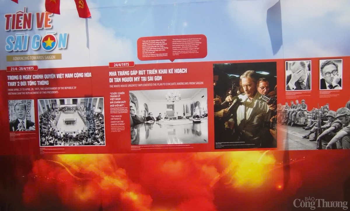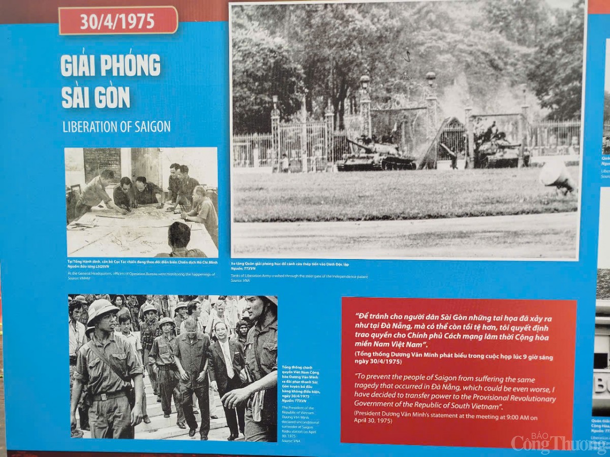 | Cao trào của triển lãm là chủ đề “Tiến về Sài Gòn”, ghi lại thời khắc lịch sử lúc 11h30 ngày 30/4/1975, khi Tổng thống chính quyền Sài Gòn Dương Văn Minh tuyên bố đầu hàng vô điều kiện. Chiến dịch Hồ Chí Minh toàn thắng, đất nước thu về một mối, khát vọng thống nhất của dân tộc suốt hơn hai thập kỷ kháng chiến đã trở thành hiện thực. |