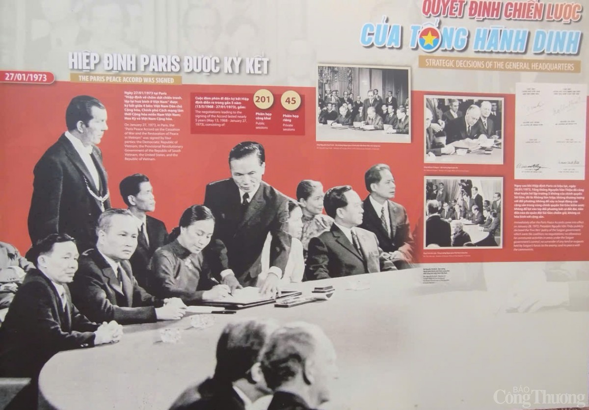 | Ở chủ đề “Quyết định chiến lược của Tổng hành dinh”, triển lãm tái hiện bối cảnh đất nước sau Hiệp định Paris năm 1973, khi thời cơ giải phóng hoàn toàn miền Nam dần chín muồi. Từ Tổng hành dinh tại Hầm D67, các quyết định chiến lược như “Kiên định con đường cách mạng bạo lực” hay “Nắm vững thời cơ, chỉ đạo linh hoạt” được đưa ra, đặt nền móng cho cuộc Tổng tiến công và nổi dậy mùa Xuân 1975. |