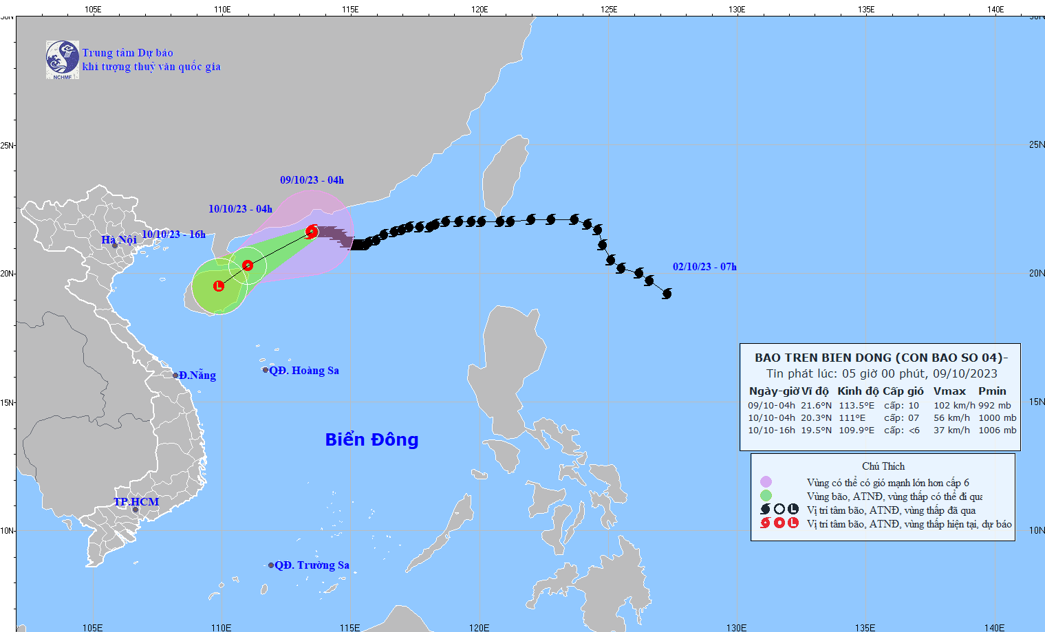 Dự báo thời tiết biển ngày mai 10/10, vùng biển phía Tây Bắc của khu vực Bắc Biển Đông có gió mạnh cấp 6 - 7, vùng gần tâm bão đi qua mạnh cấp 8, giật cấp 10; biển động rất mạnh; sóng biển cao 2,0 - 3,0m, vùng gần tâm bão sóng cao 4,0 - 6,0m. Khu vực vịnh Bắc Bộ có gió Đông Bắc mạnh cấp 6, giật cấp 8; biển động; sóng biển cao từ 2,0 - 3,0m.