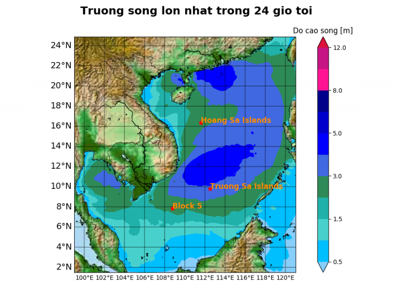 Ở vùng biển phía Tây của khu vực Nam Biển Đông (bao gồm cả vùng biển phía Tây của quần đảo Trường Sa), vùng biển từ Khánh Hòa đến Cà Mau, sẽ có gió mạnh cập 6, giật cấp 7-8. Biển động. Độ cao sóng từ 2-3m.