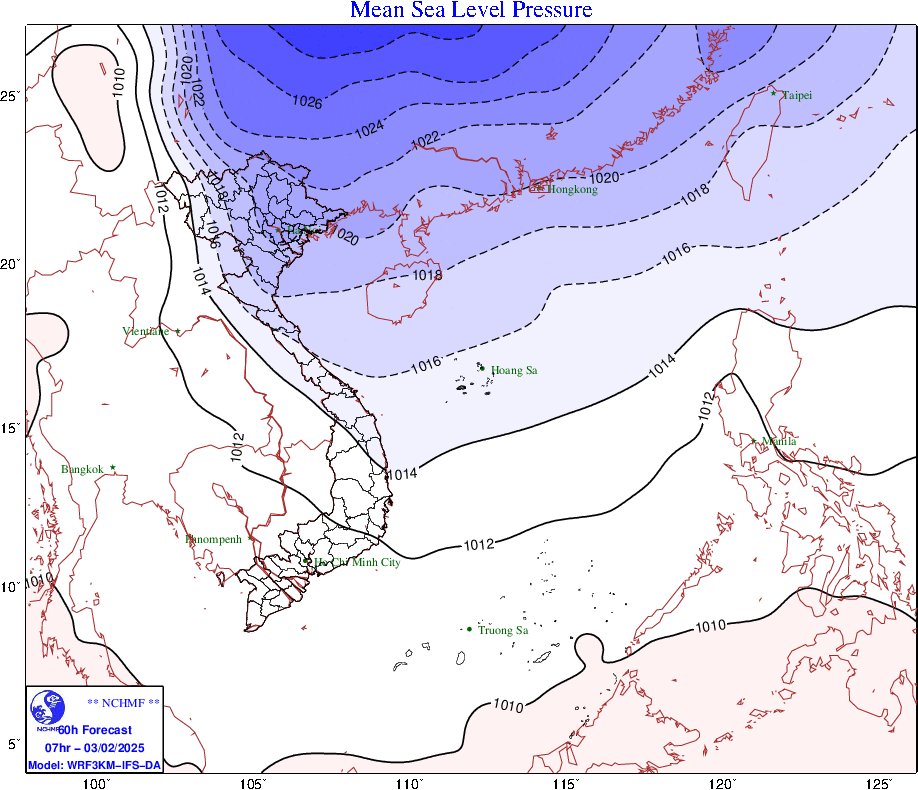 Từ đêm 3/2 vùng biển từ Quảng Trị đến Bình Thuận, khu vực Giữa Biển Đông và vùng biển phía Tây khu vực Nam Biển Đông (bao gồm vùng biển phía Tây quần đảo Trường Sa) gió Đông Bắc mạnh dần lên cấp 6, có lúc cấp 7, giật cấp 8-9, biển động mạnh, sóng biển cao 2-4m.