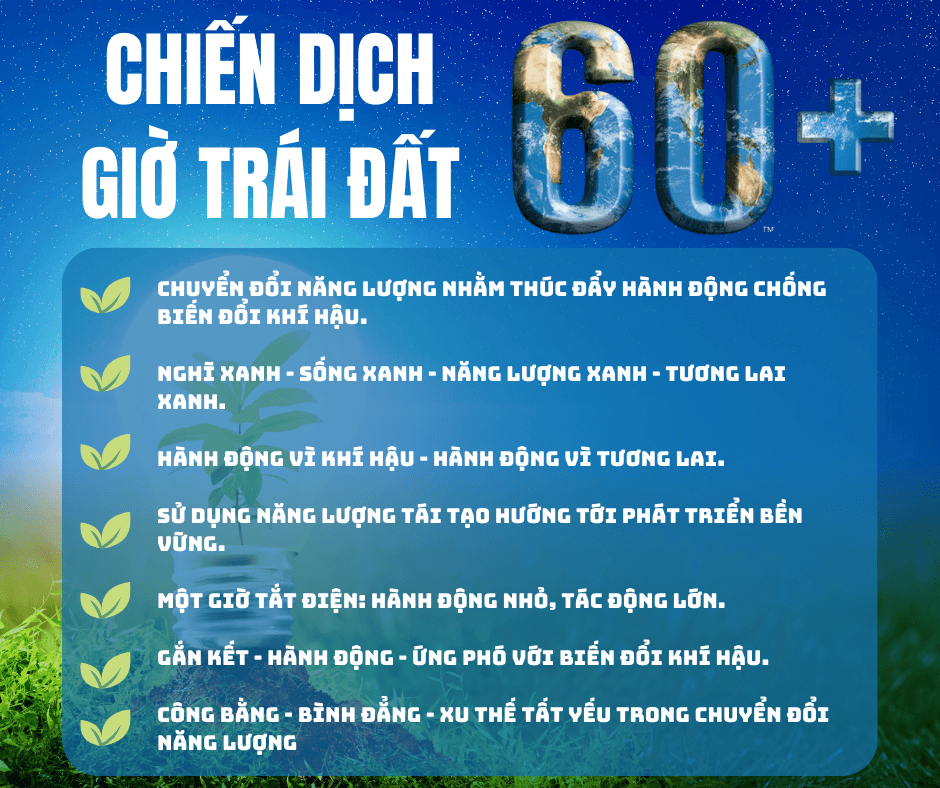 Các cơ quan, tổ chức, cá nhân cùng tổ chức hoạt động “Tắt đèn và tắt các thiết bị điện không cần thiết” từ 20h30 đến 21h30 ngày 30 tháng 3 năm 2024 (Thứ Bảy); duy trì thường xuyên, liên tục thói quen sử dụng năng lượng hiệu quả, tiết kiệm gắn với bảo tồn tài nguyên năng lượng từ sản xuất công nghiệp, thương mại dịch vụ, giao thông vận tải, sản xuất nông ngư nghiệp cho đến tiêu thụ tại hộ gia đình nhằm cân bằng giảm phát thải khí nhà kính và hướng tới mục tiêu chuyển đổi tối đa sang năng lượng tái tạo.